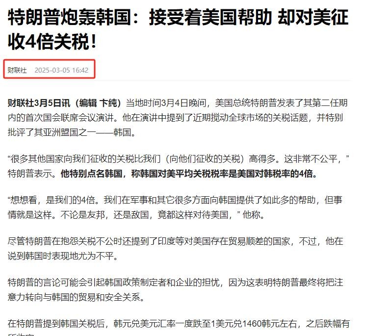 特朗普在演讲中指出,韩国对美国的关税税率过高,占了美国的便宜,而美国却还要为韩国提供安全保障。