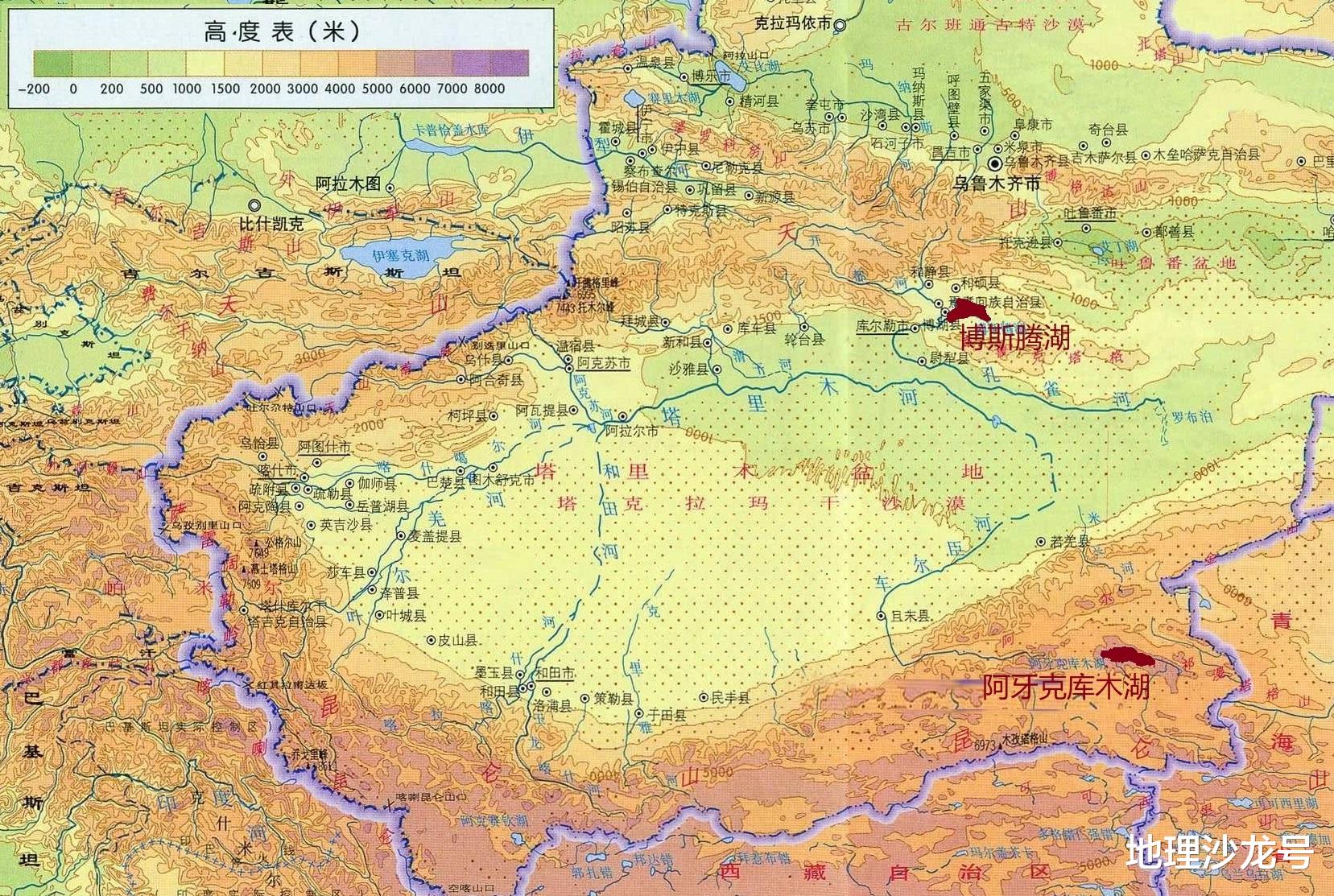 新疆地处欧亚大陆腹地,四周被天山、昆仑山、阿尔泰山等山脉环绕,形成“三山夹两盆”的地貌格局。全区年均降水量不足150毫米,但冰川融水与山区降水孕育了塔里木河、伊犁河等内陆水系,滋养出罗布泊、博斯腾湖等标志性湖泊。阿牙克库木湖位于阿尔金山与昆仑山交界处,海拔4800米,是一座典型的高山堰塞湖。其水源主要依赖冰川融水和季节性降水,湖水盐度较低,周边分布着高原草甸和湿地生态系统。而博斯腾湖地处天山南麓的焉耆盆地,海拔1048米,作为中国最大的内陆淡水吞吐湖,曾通过开都河与孔雀河维系着塔里木河下游的生态平衡。