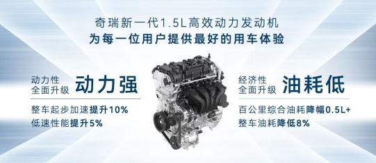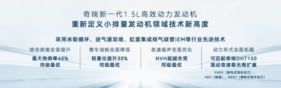 奇瑞新一代1.5L高效动力发动机,采用米勒循环等行业先进技术。综合效能全面提升,最大热效率40%,同级最优;整车油耗全面降低,轻量化提升30%,同级最优;怠速噪声全面优化,NVH超越合资,同级最优。除了性能上的全面提升,动力形式也进行了全面拓展,可匹配奇瑞DHT130混动变速箱无限扩展,适配PHEV、HEV、REEV等多种车型。