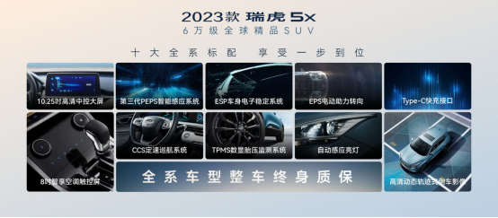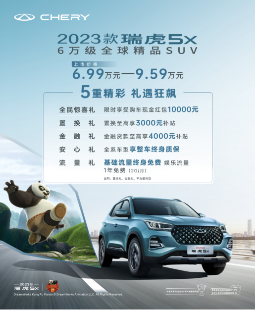 2023款瑞虎5x颠覆同级市场品质,凭借“十大全系标配”,从动力、颜值、配置全面开卷,以“超级性价比”席卷6万级SUV市场。