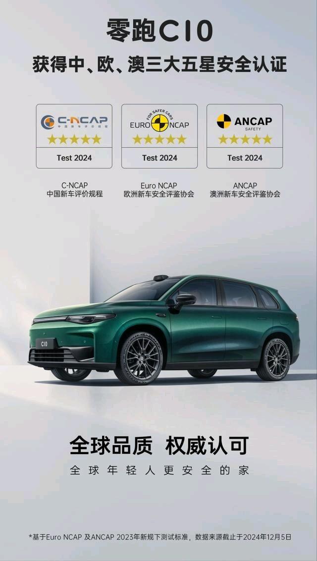 安全:按三大五星标准做,电池安全也放心零跑C10 在安全方面做得很实在,是按照中国 C-NCAP、欧洲 E-NCAP、澳洲 ANCAP 这三个五星安全标准来设计的,不管是在国内开还是出口到国外,安全都有保障。