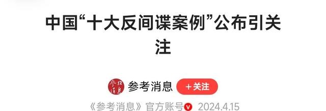 信息来源:参考消息2024年4月15日发布文章《中国“十大反间谍案例”公布引关注》