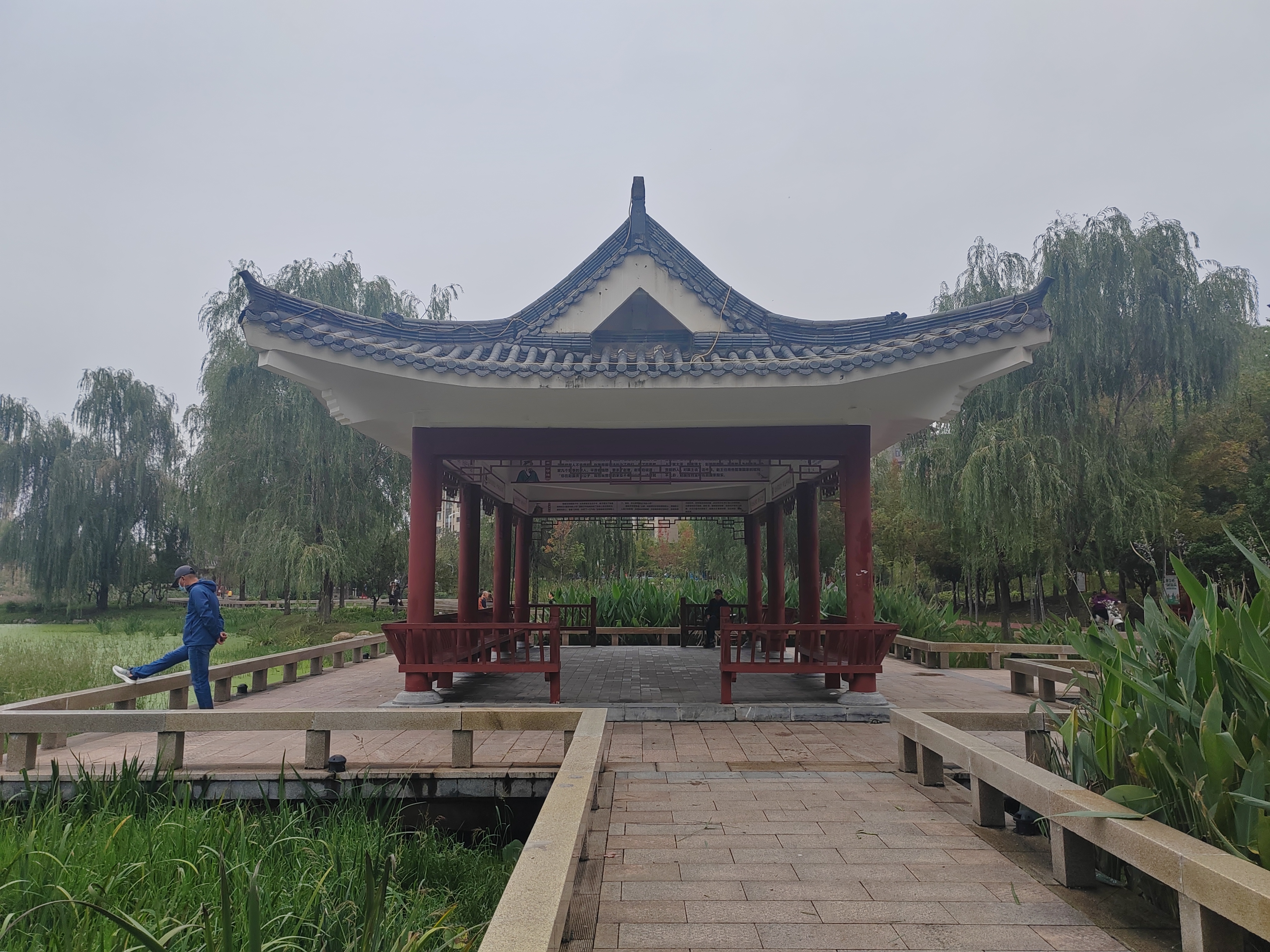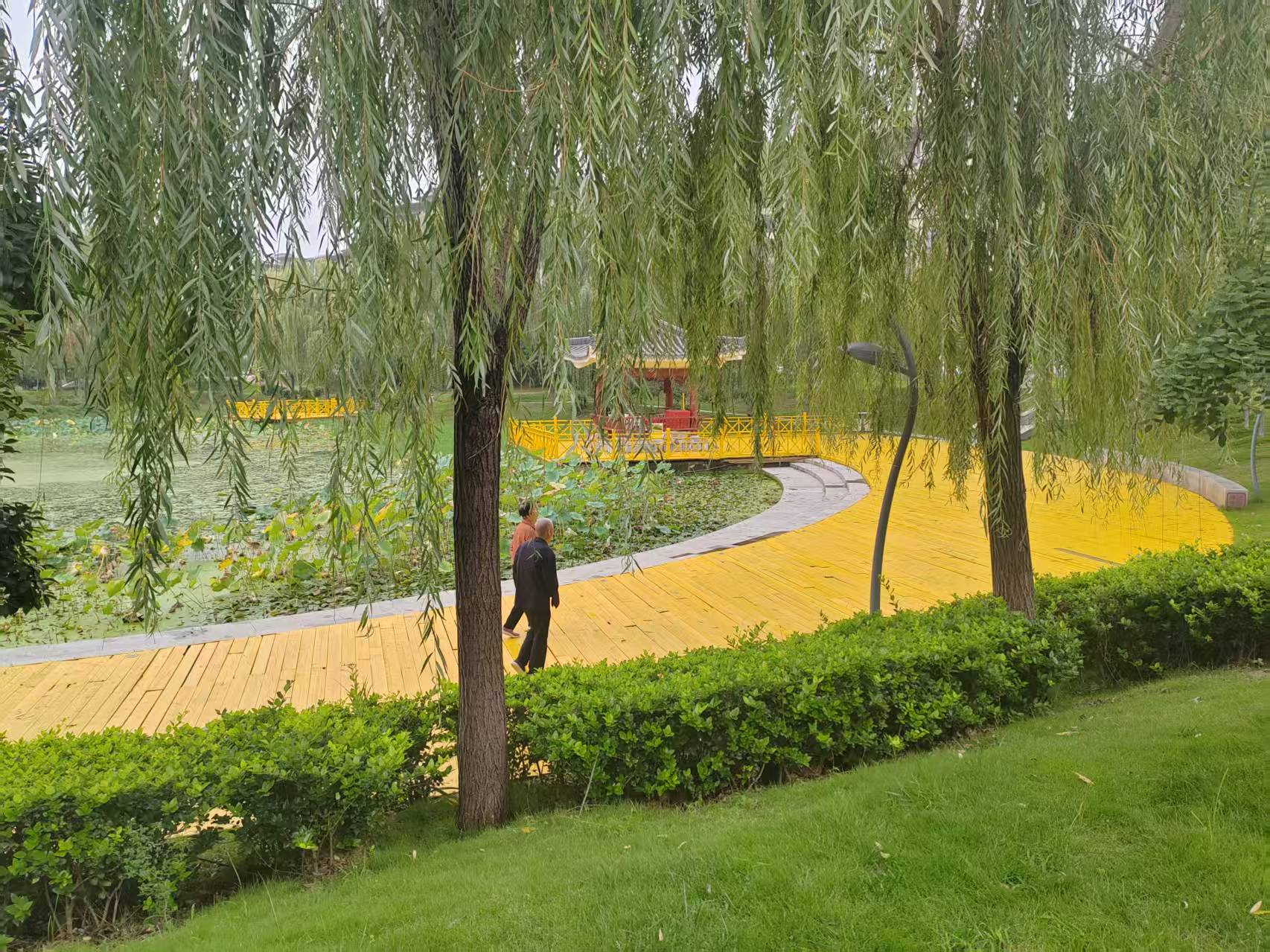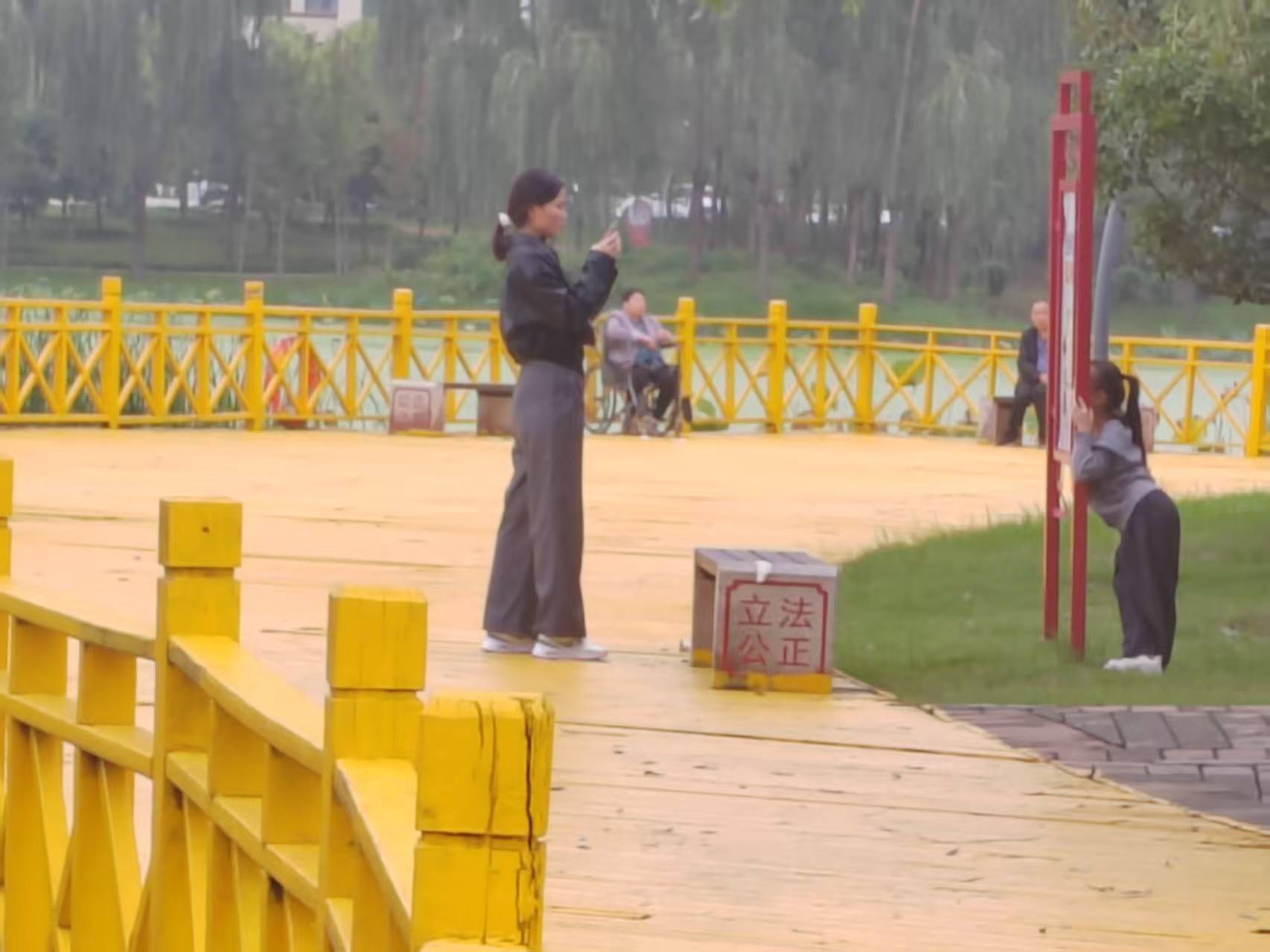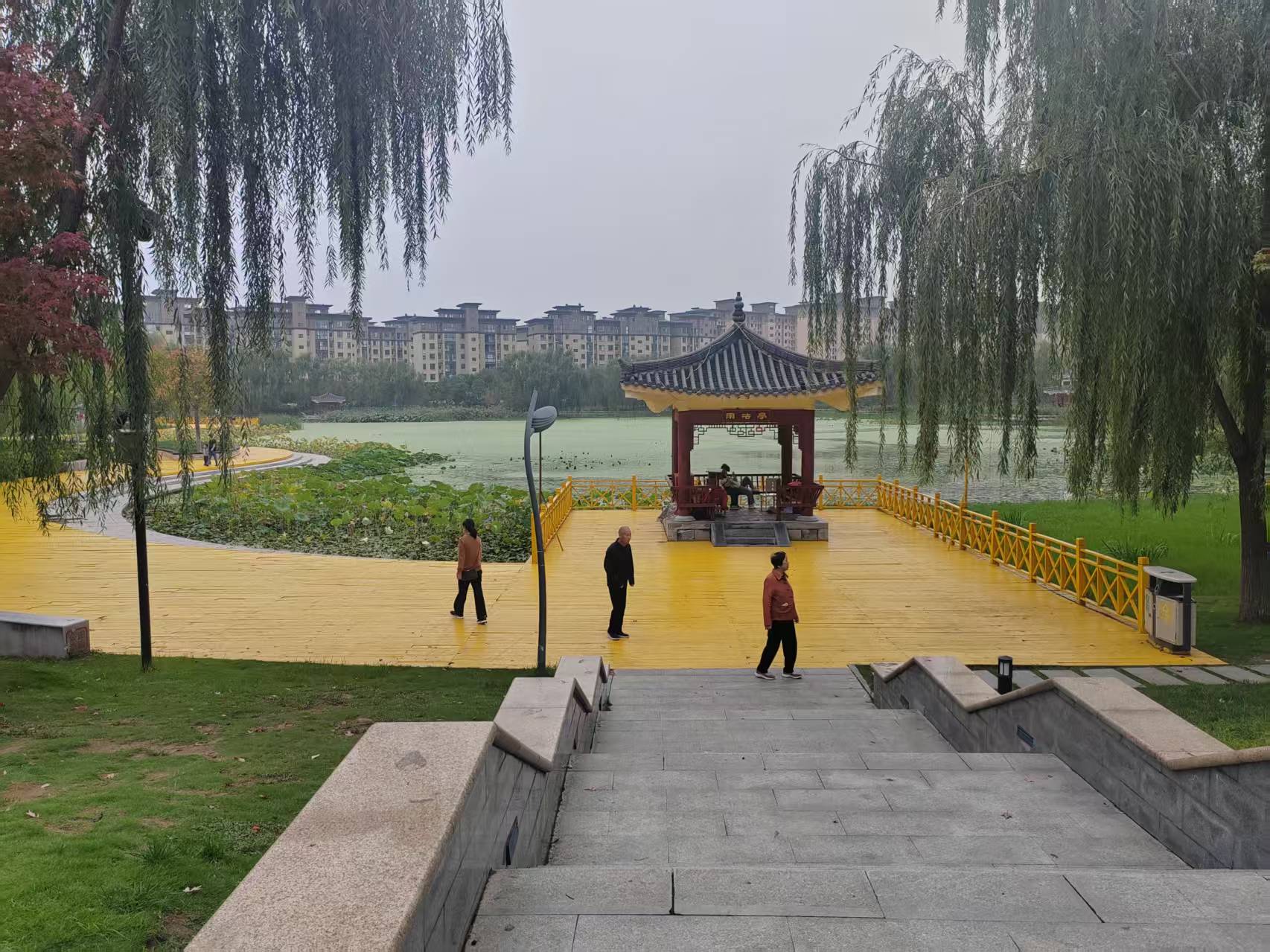 忽然想起这方湖水曾是汝南八大景之一,千百年来静静环抱城池。如今再看,没有名湖的喧嚣,唯有岁月沉淀的从容——岸边新修的木栈道与古旧的石拱桥相映,国庆的小红旗在柳梢轻晃,中秋的圆月似已提前藏在湖心,等着夜幕降临便洒下满湖清辉。