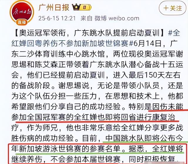 今年5月份全国跳水冠军赛场上没等来全红婵的身影,如今却又因旧伤复发,再次缺席新加坡世锦赛。