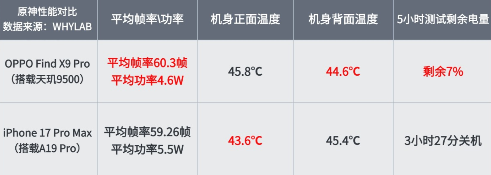 通过多家数码头部博主重度游戏性能测试可知,OPPO Find X9系列在游戏流畅度、帧率稳定、功耗把控上都有着不俗表现,其中在博主WHYLAB的5小时原神重度测试中,对比iPhone 17 Pro Max帧率、功耗、续航优势都十分明显。