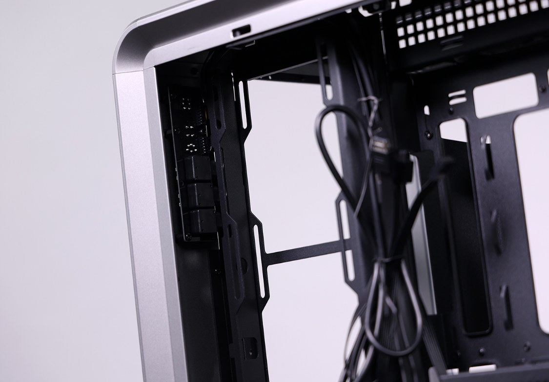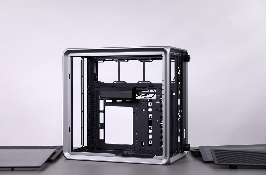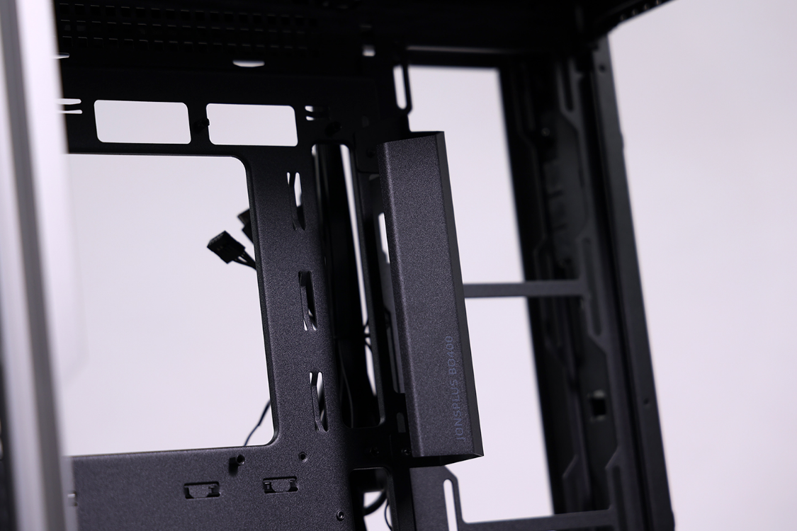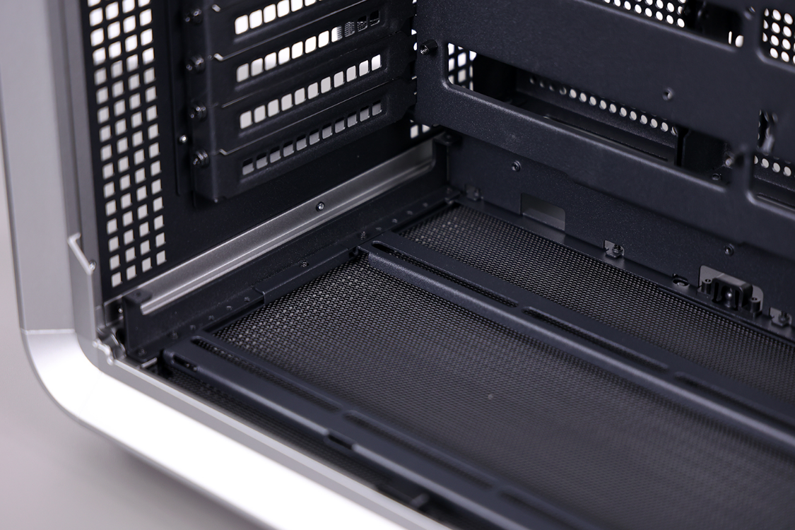 机箱顶部、侧面、底部的风扇支架均采用了可拆卸设计,侧面的风扇支架还支持安装夹汉堡式水冷,让玩家可以根据需要规划机箱内部风道。