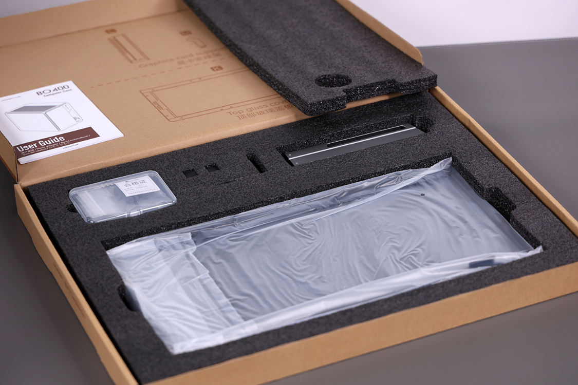 机箱配备独立配件盒,其中包含1个铝合金材质的显卡支架,以及一块钢化玻璃面板(可以替换顶部面板,组成三面透视的海景房效果)。