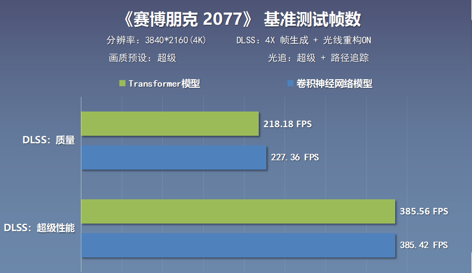 《赛博朋克2077》基准测试,将画质设为超级,光追设为路径追踪模式,开启DLSS 4.0,并将多帧生成倍率设为4X,4K分辨率下,游戏在DLSS质量和超级性能档位下的游戏帧数如图: