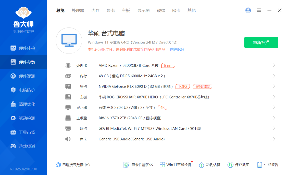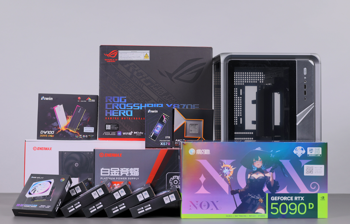 完整配置单:AMD R7-9800X3D处理器、华硕ROG X870E Hero主板、影驰RTX 5090D星曜NOX OC显卡、佰维时空行者DW100 6000C28 24G*2内存、佰维X570 PCIe5.0 2T M.2固态硬盘、安耐美白金竞蝠PK1000W电源、安耐美LMIV360一体式水冷、乔思伯BO400 铝制机箱、影驰魅影黑色散热风扇*7(6反+1正)...按时下行情,整机花费应该在3.3个W左右,仅供参考。