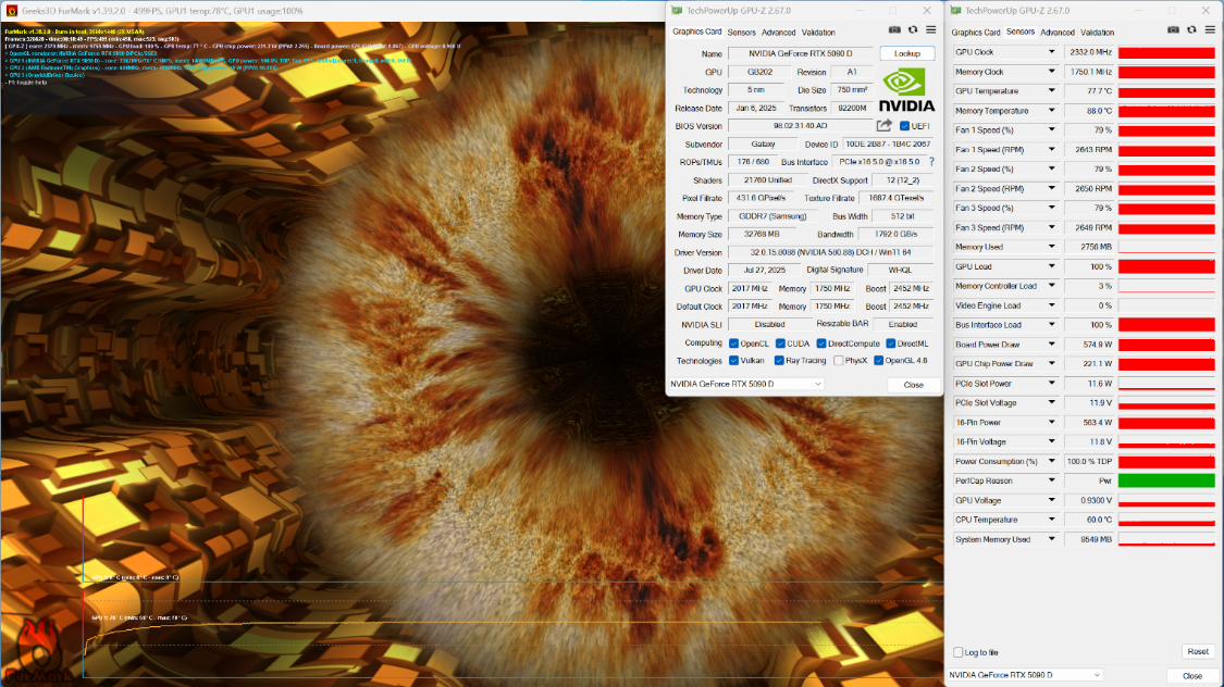 FurMark烤机测试,烤机10Min+,显卡温度77°左右,显卡功耗575W左右;