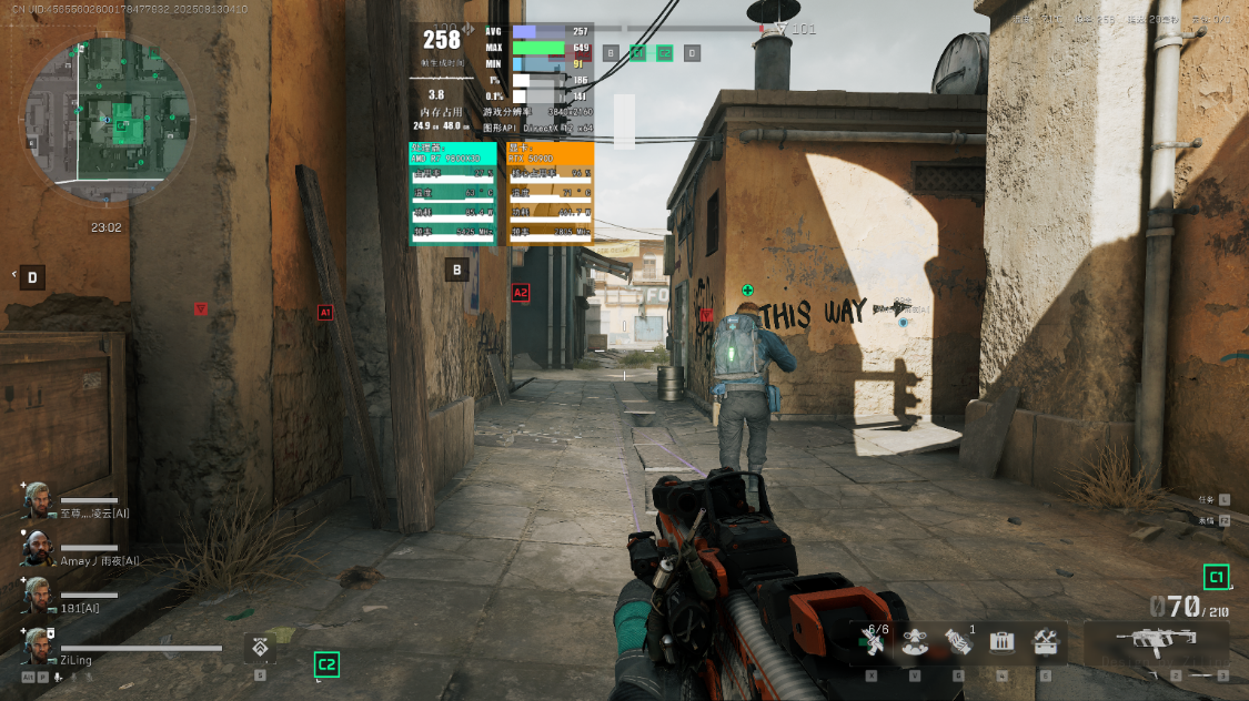 《三角洲行动》游戏中,极致画质,4K分辨率下,开启DLSS帧生成并设为性能优先模式,游戏帧数为300 FPS左右,将DLSS设置改为质量模式,其他设置不变时,游戏帧数为260 FPS左右;