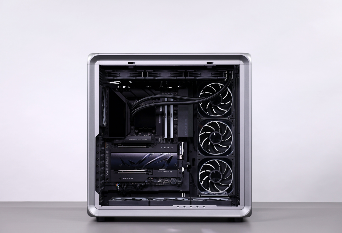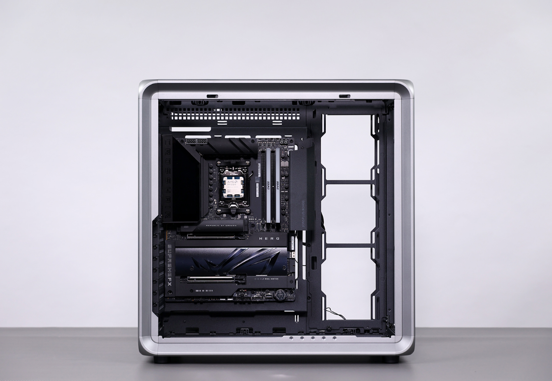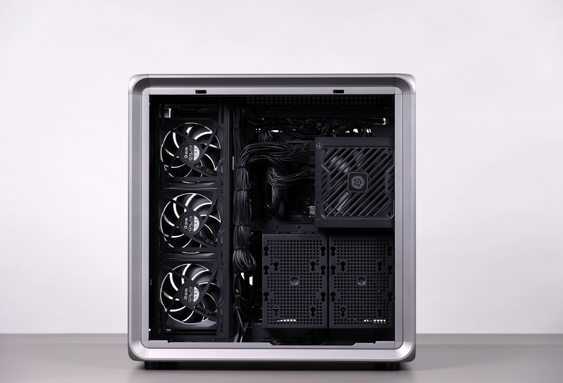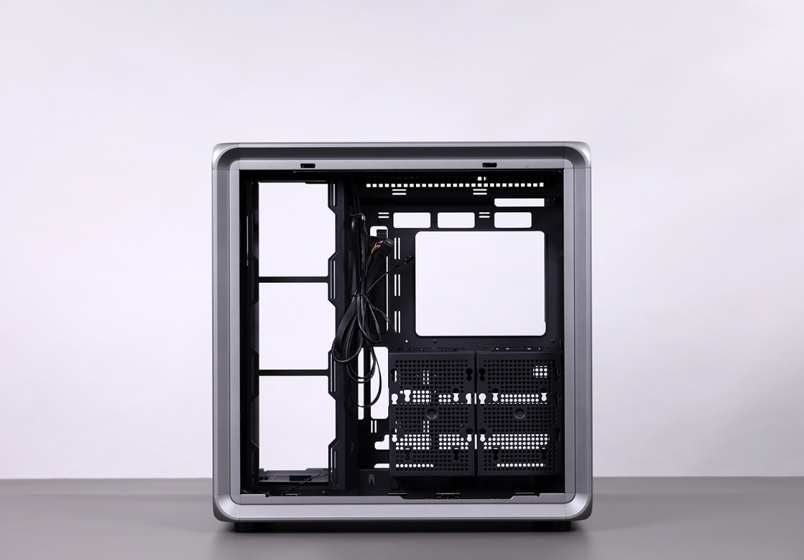 机箱内部空间宽敞,最大支持ATX主板(背插ATX也支持),显卡安装限长435mm,风冷限高173mm,也支持顶置、侧置以及在机箱底部安装360规格冷排,整个机箱最多可同时安装10把120mm规格散热风扇。