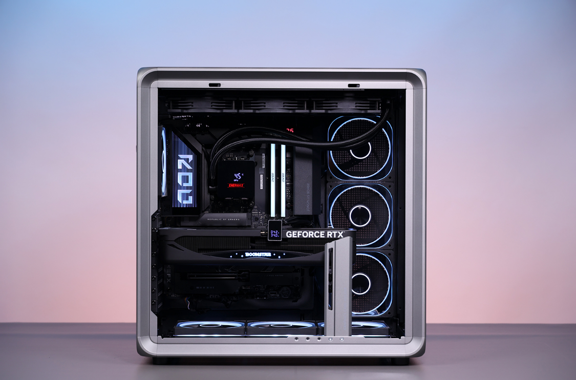 整机绝对预算大户,当然是这块5090D星曜NOX OC显卡。全黑配色,低调但内在绝对足够优秀。显卡搭载可以免工具拆装的磁吸一体上盖,方便除尘的同时,也将星曜系列显卡DIY属性完美继承下来。性能方面,应该不用我吹了吧。