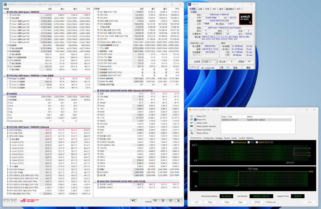 主板方面,本着不差钱跟信仰的原则,选配的是这款全黑但带眼睛的华硕ROG X870E Hero主板。豪华的18(110A)+2(110A)+2相供电设计,以及御三家强大的bios调教能力,拉满9800X3D性能当然不在话下。