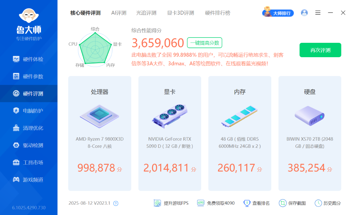鲁大师整机测试得分365.9W分,应该能打败99%的朋友吧?