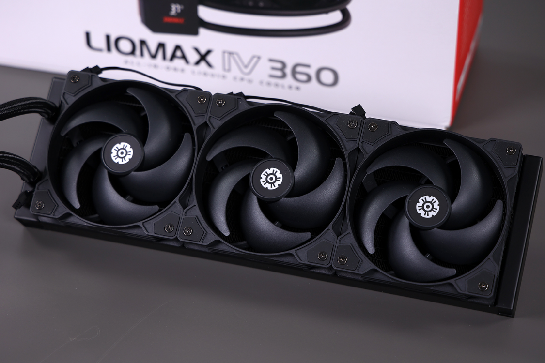 水冷出厂预装3把厚度达到了26.8mm的120mm规格的黑色无光风扇。风扇采用高转速马达和静音轴承,最高转速可达1800RPM±10%,搭配上5片流线型高强度叶片,最高可提供58.03CFM的风量和2.4mmH2O的风压,而最大运行噪音仅有23.46分贝。风扇之间采用一线通设计,可以降低玩家理线难度;