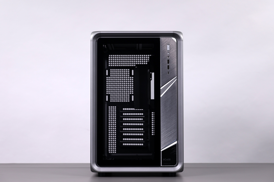 前玻璃侧板右侧是一块表面有金属拉丝工艺处理铝合金材质的I/O面板(含:开机按钮、ARGB控制键、二合一音频口、2个USB 3.2 Gen1 Type-A接口以及1个USB 3.2 Gen2 Type-C接口),此外,面板表面还有斜切开槽设计,设计感十足。