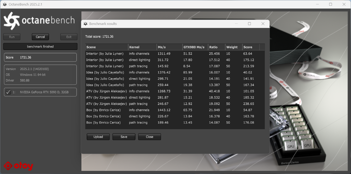 OctaneBench 2025.2.1显卡渲染性能基准测试,RTX5090D 星曜NOX OC显卡得分1721.36分;