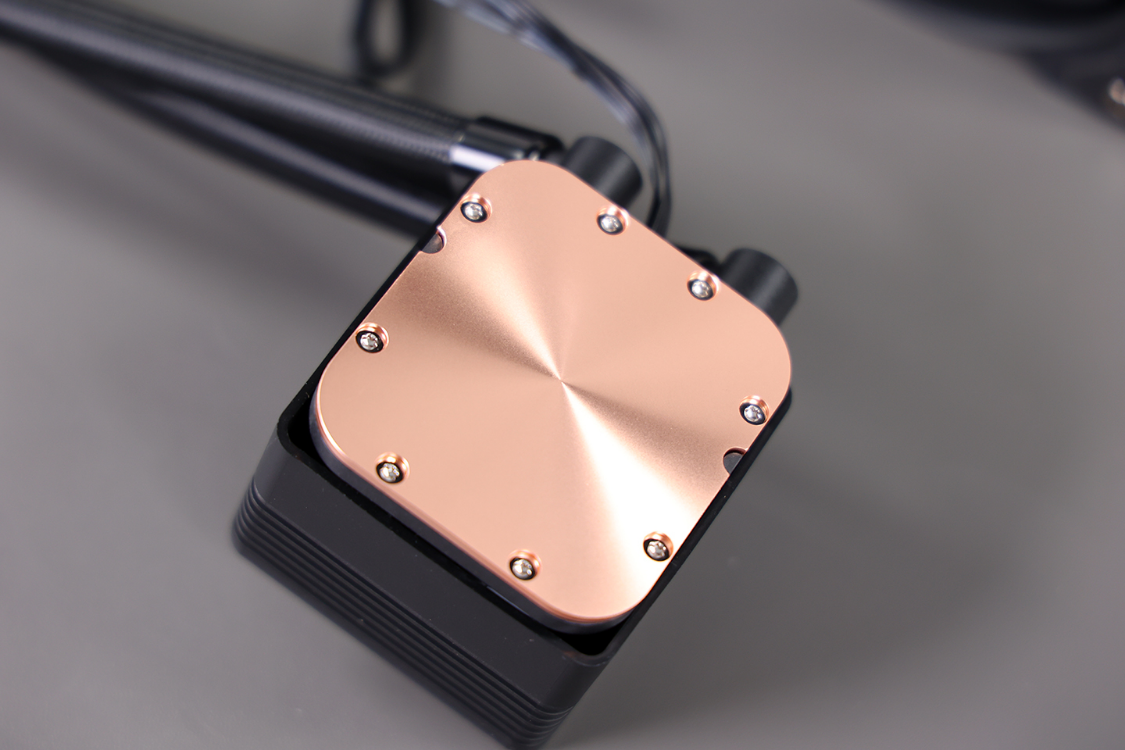 铝合金材质的散热冷排采用全黑配色,内置12条微水道,在两条采用高柔韧性、低渗透聚酰胺橡胶材质的400mm水冷管的加持下,可以快速将冷头和CPU上的热量传入冷排中,水冷管两端的金属加固端子和包装在水冷管外侧的编织网则可大大提高水冷的耐用性。