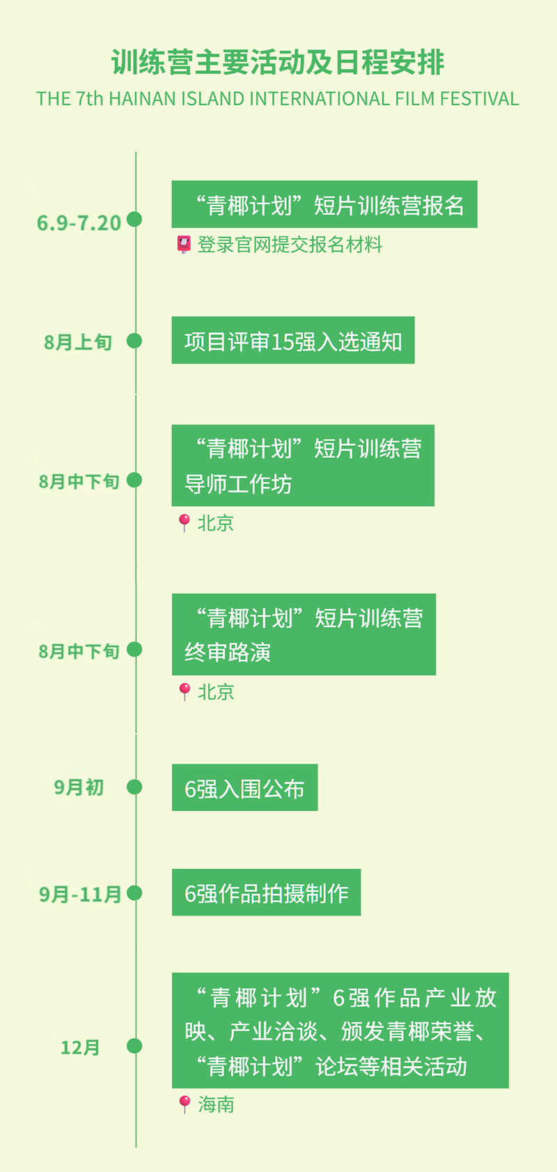 第七届海南岛国际电影节“青椰计划”短片训练营,现正式面向广大创作者招募青年影人短片项目,提供即时开拍的机会,构建新人导演孵化通道。