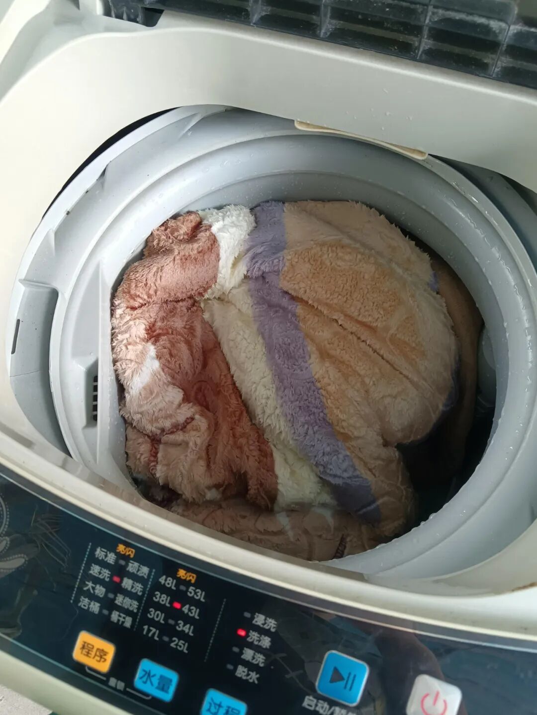 毛毯放洗衣机里转不动,根本转不动,洗衣液倒了,水也放了,洗衣机原地转,这毛毯就只能找个大盆,用脚踩。