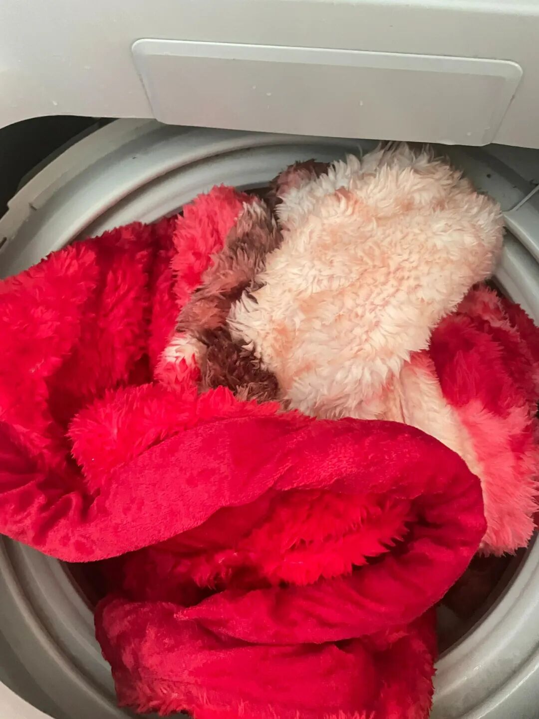就算是勉强洗完了,整张毯子原本很细腻的毛毛,也会变成粗糙的泰迪毛,打卷还硬。