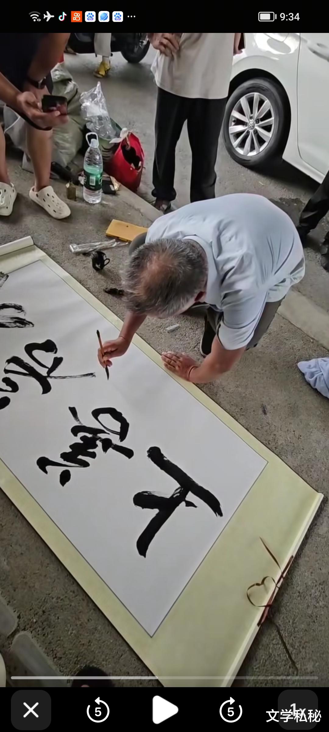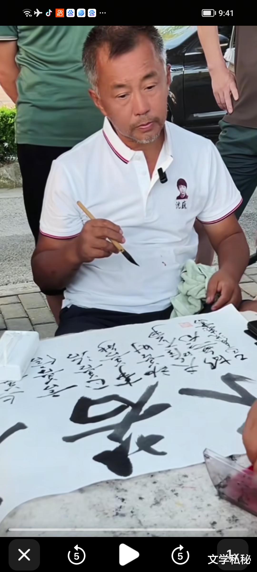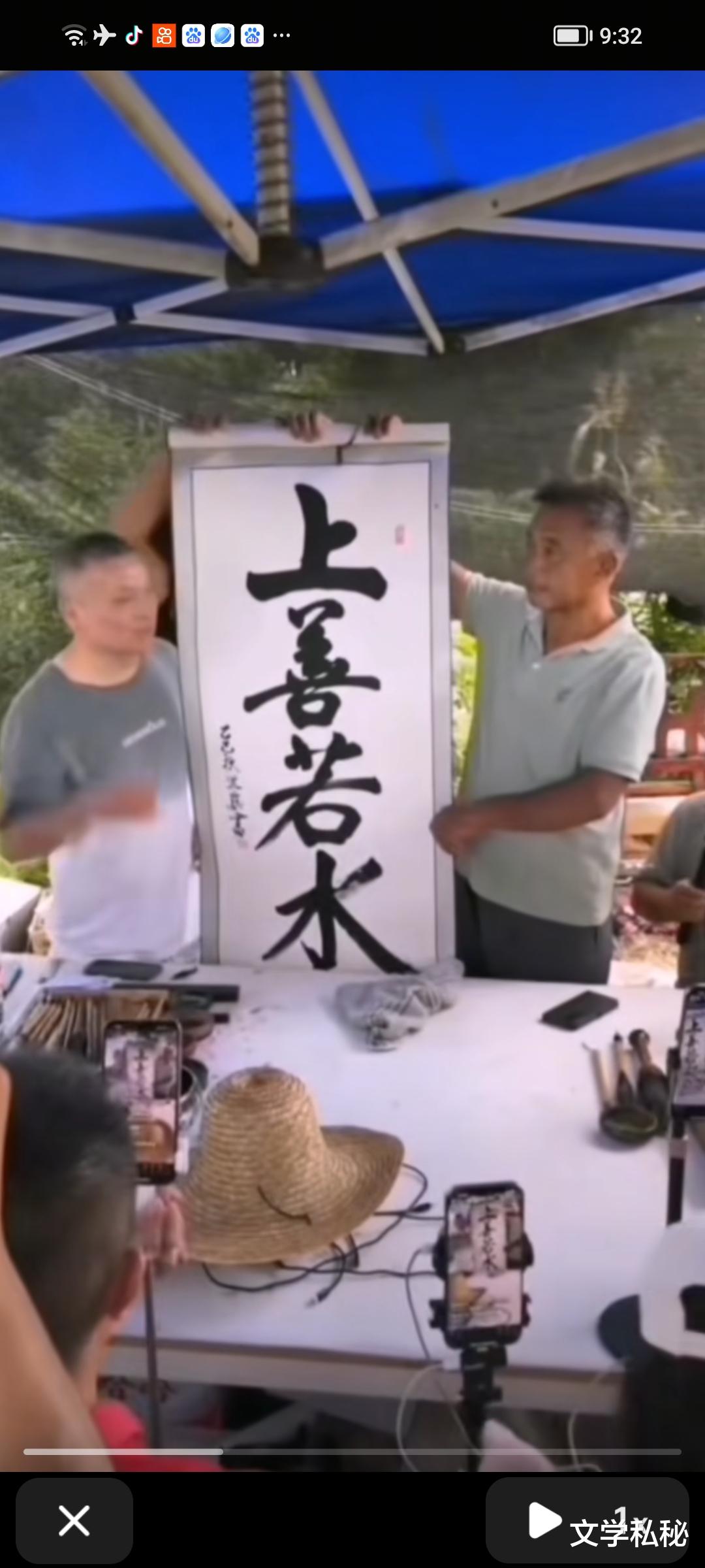 8月19日,那时候沈巍还在白鹤镇的一条南北向的田间小路上进行他的书画作业,有一位做点小生意的小伙,想请他写“上善若水”,沈巍当即反问道:“做小生意跟上善若水有什么关系呢?”