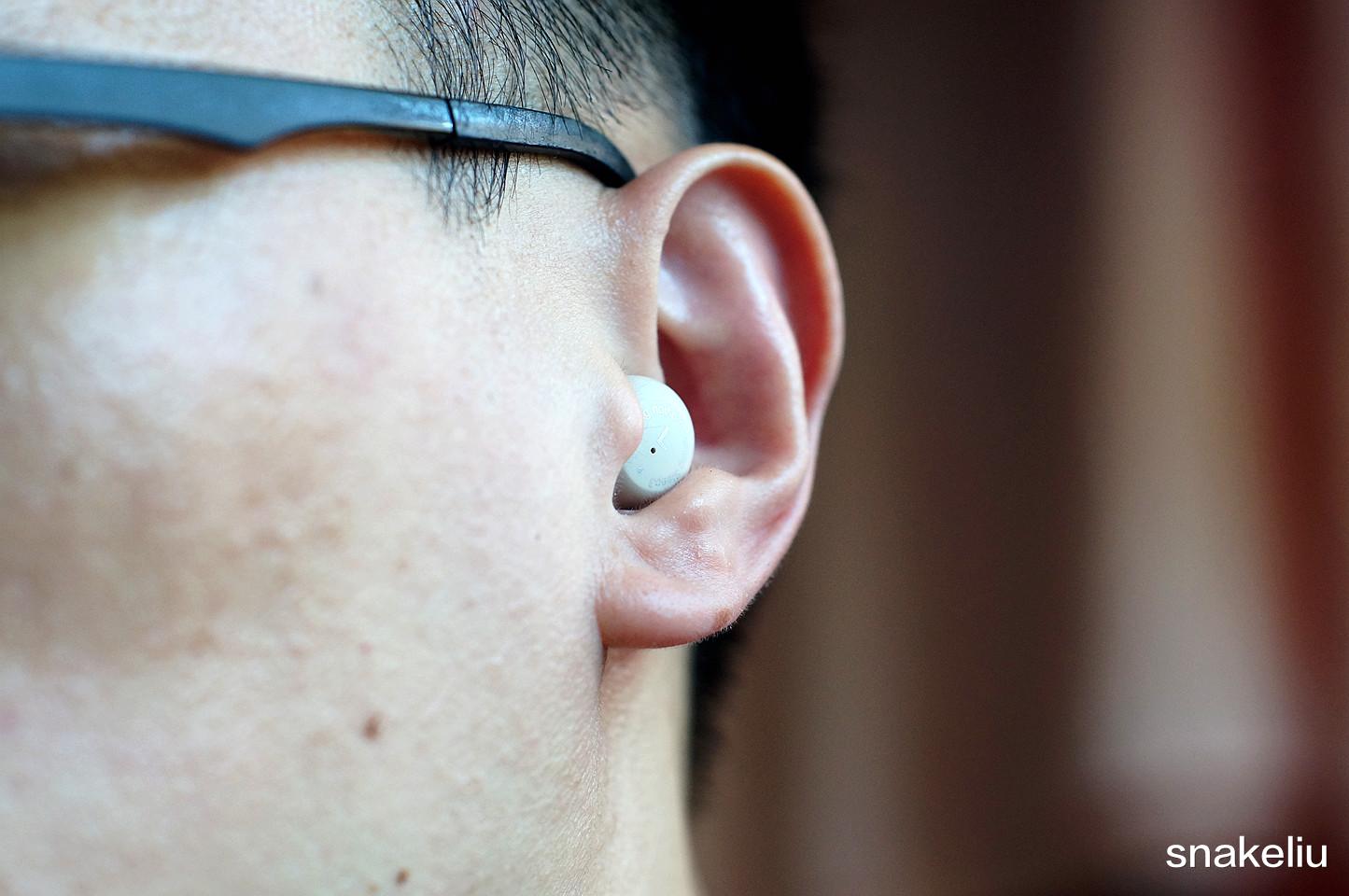 耳机非常小巧,佩戴比一般耳机需要点技巧,感觉是把整个耳机塞入了耳道。比较敷贴,耳朵也没有特别的不舒服。这样的小耳机,佩戴后接触面是很小,在加上这耳机一般时间都是睡觉时佩戴,所以厂家取消了触控功能吧。