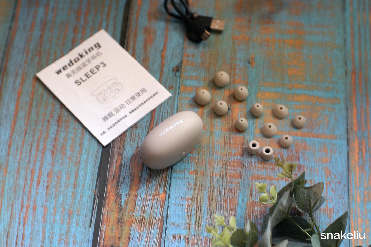 就是这款由wedoking出品三代睡眠耳机,它不仅仅是一款入耳式耳机,配合不同的耳帽还能做到抵制噪音,给你创造安静的环境提升睡眠质量。先来看看耳机内,除了耳机本体,充电线和说明书。耳机提供了多达7副的耳帽,从普通耳帽到睡眠耳帽还有一副带记忆绵的耳帽。这些耳帽构成了不同降噪效果,从20db到35db不等,而研究发现人们理想的睡眠噪音就要控制在30db内。