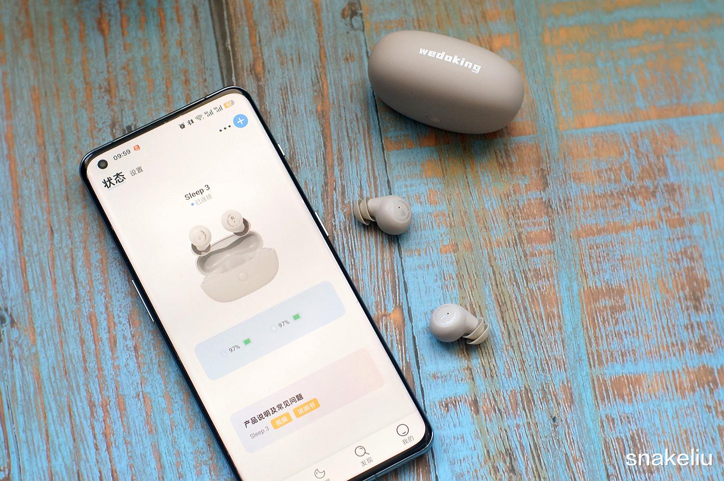 wedoking三代睡眠耳机非常小巧,单只耳机只有2.5g重,wedoking还设计了更贴合的双层耳帽,在实用中不仅可以方便的佩戴耳机,而且小巧的耳机也不宜从耳道内掉落。这种小巧轻巧的耳机,佩戴起来几乎没有感觉,而且为了怕出现误操作的问题,也取消了耳机上的触控功能,操作只能通过手机端来实现。