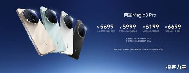 荣耀Magic8系列已于2025年10月15日正式发布,并在10月23日在荣耀官方渠道及合作平台启售。荣耀Magic8标准版配备旭日金、天青釉、雪域白、绒黑色,售价4499元起;荣耀Magic8 Pro配备旭日金砂、天青色、雪域白、绒黑色,售价5699元起。