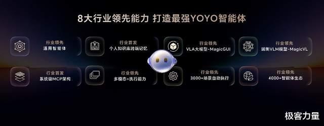 荣耀魔法大模型3.0,具有端云结合的大模型矩阵,在多模态理解、任务规划和工具调用等核心能力上,持续进化,紧密协同,达到比肩SOTA的业界顶尖水平。基于荣耀魔法大模型3.0的YOYO智能体,获得中国信通院L3级卓越型权威认证,代表了当前智能体泛化能力的最高水平。