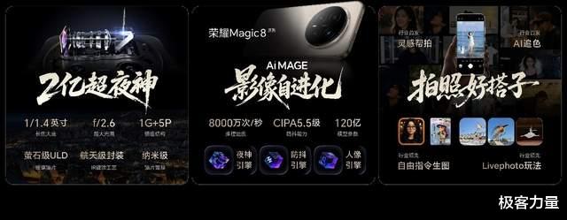 顶级影像硬件配置之外,全新荣耀AiMAGE影像系统也带来了荣耀Magic8系列影像表现进化。AiMAGE·夜神引擎,拥有8000万次/秒推理速度,精确处理明暗复杂光影;AiMAGE·防抖引擎,大幅提升陀螺仪和马达等硬件工作精度,荣耀Magic8 Pro主摄和长焦实现了CIPA 5.5级防抖能力;AiMAGE·人像引擎,高达120亿模型参数,带来肤质优化、光影还原、光斑拟真三大升级,无论日夜,都能拍出大师级人像效果。