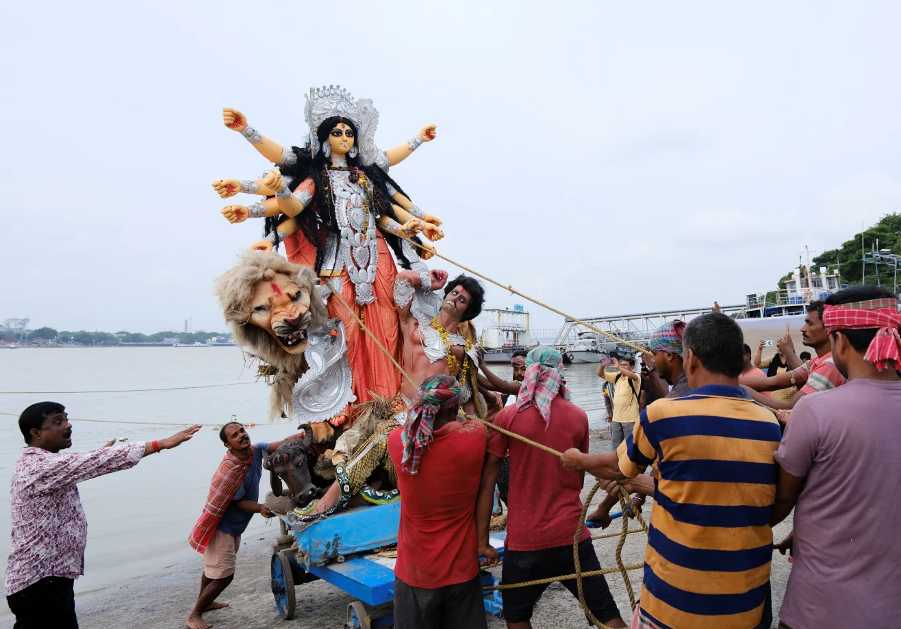 2025年10月4日,印度加尔各答,信徒们将印度教女神杜尔迦的神像浸入恒河,标志着杜尔迦节庆祝活动的结束。
