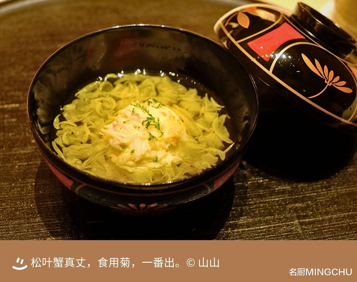 盖碗一打开,一片金菊便绽放在眼前。拆出的松叶蟹肉清甜,制成丸子,内里还带着流心的蟹黄。真昆布、鲣节和日本温泉水做的出汁中洒落着菊花花瓣,喝到嘴里柔嫩无比,让人不忍咬下,汤头与秋菊的清幽氤氲开来,把秋天的清雅做到了极致。