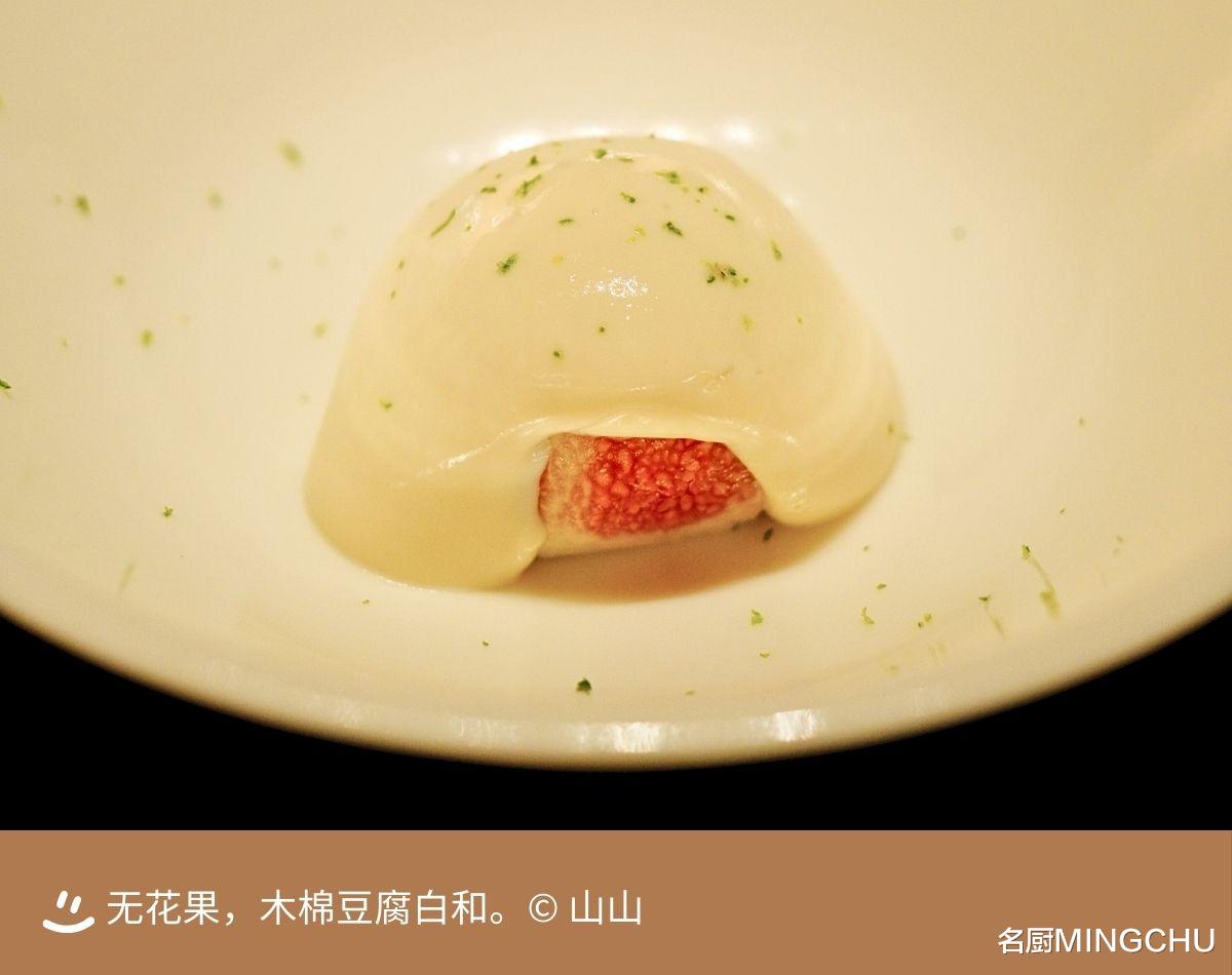 白和是把木棉豆腐先压出水分,再加入芝麻等调料,细细研磨成轻盈又顺滑的酱汁,犹如一朵云顶盖在流着蜜汁的无花果上,圆润可爱。豆香与芝麻香交织,层层叠叠,竟散发出近似乳酪的奶香。