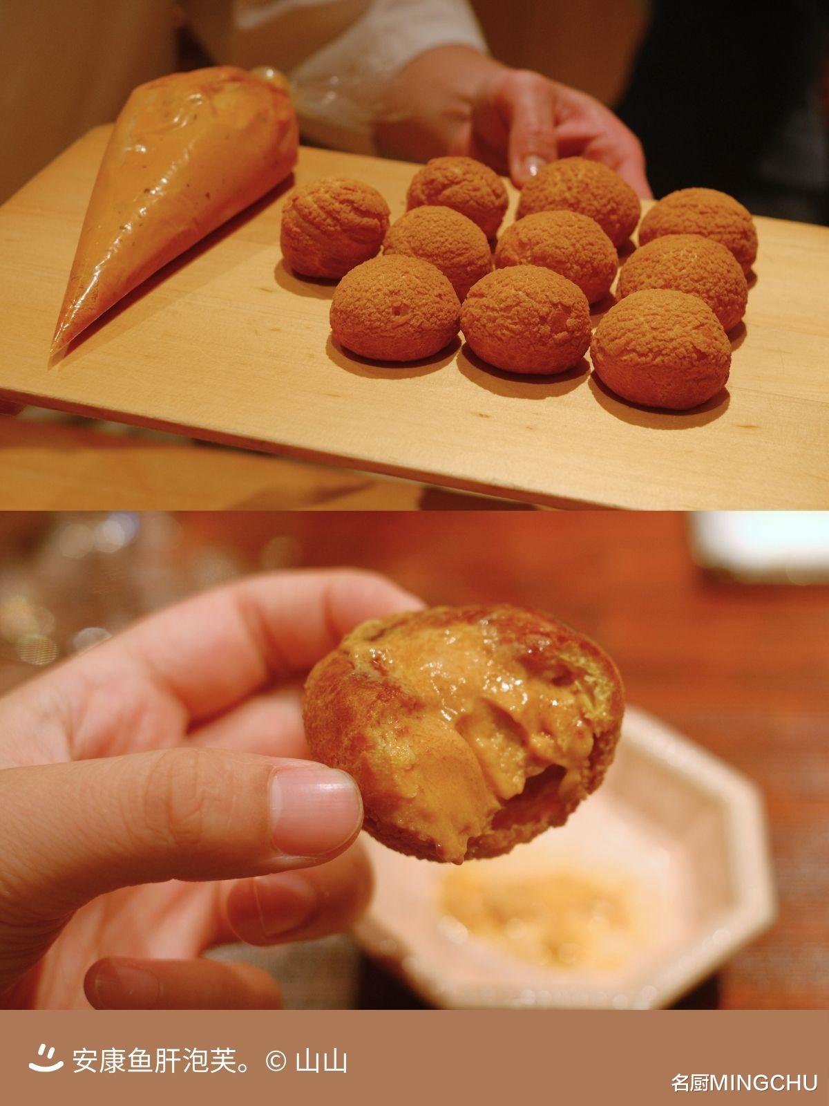 最后压轴的,是云隐最出名的甜点——安康鱼肝泡芙。以香港的菠萝包为灵感,泡芙带一层薄薄的菠萝酥皮,在炉火上重新烤至温热,挤入冰凉丝滑的安康鱼肝酱。一口下去,最外层酥皮香脆,融化了边上的部分肝酱,带来一层温润流心;而最中心的酱还保持慕斯状态,一口下去,冰火之间三重口感,令人欲罢不能。据说餐厅的最高记录是有一位女客人追加了 13 个泡芙,谁能想到安康鱼肝做甜品也这么美味呢!