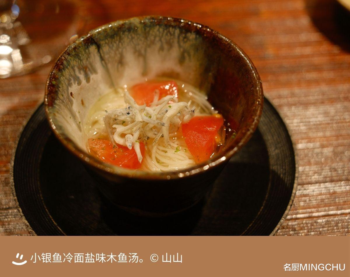 夏末余温还未散去,餐间来上这样一碗冷面最为合宜。小银鱼是沙丁鱼幼鱼,有饱满的鲜味和香气,以盐味木鱼汤与冰凉的番茄配面,嚼劲口感的细面拌上一颗多汁的番茄瓤,酸甜清冽,一口沁人心脾。