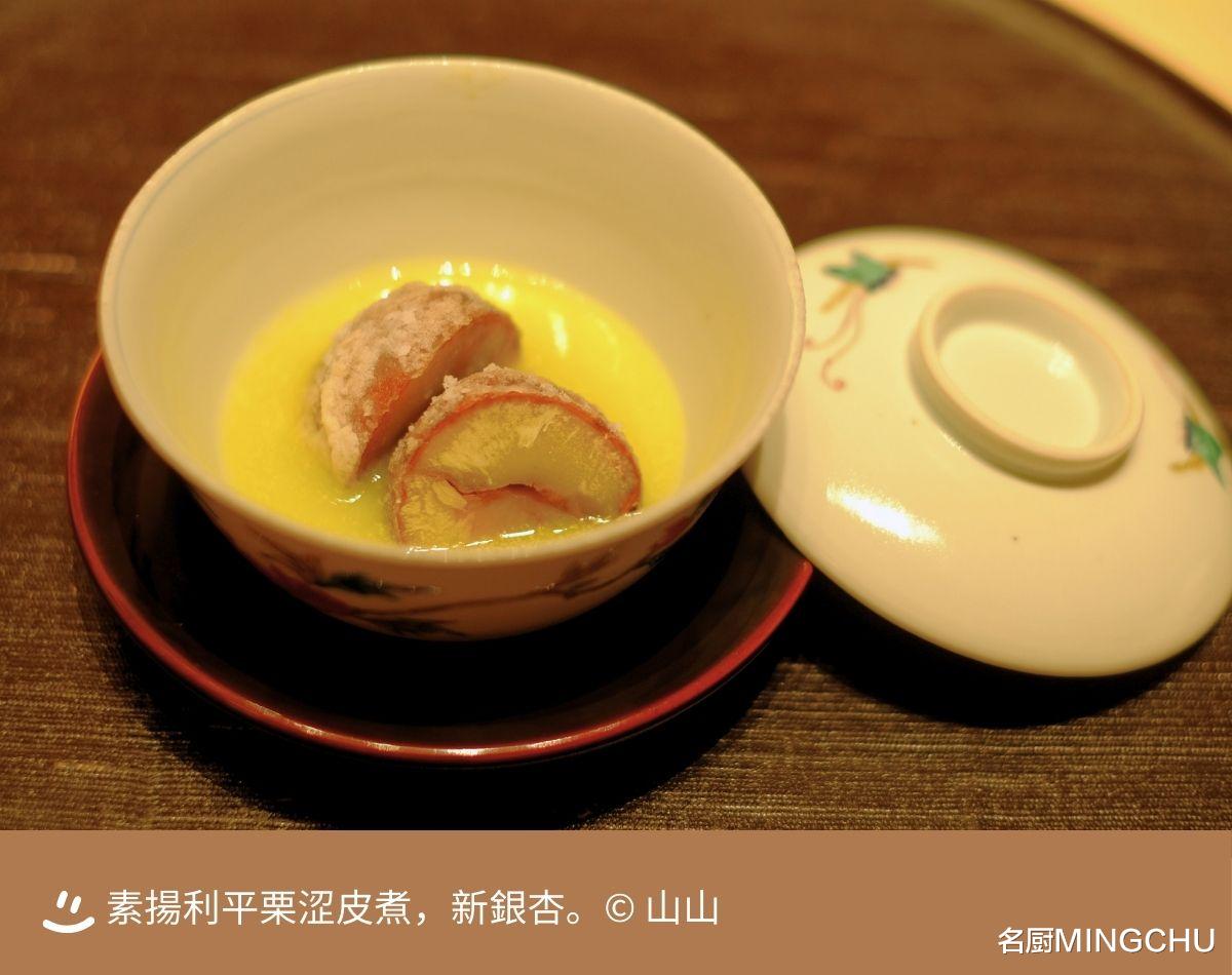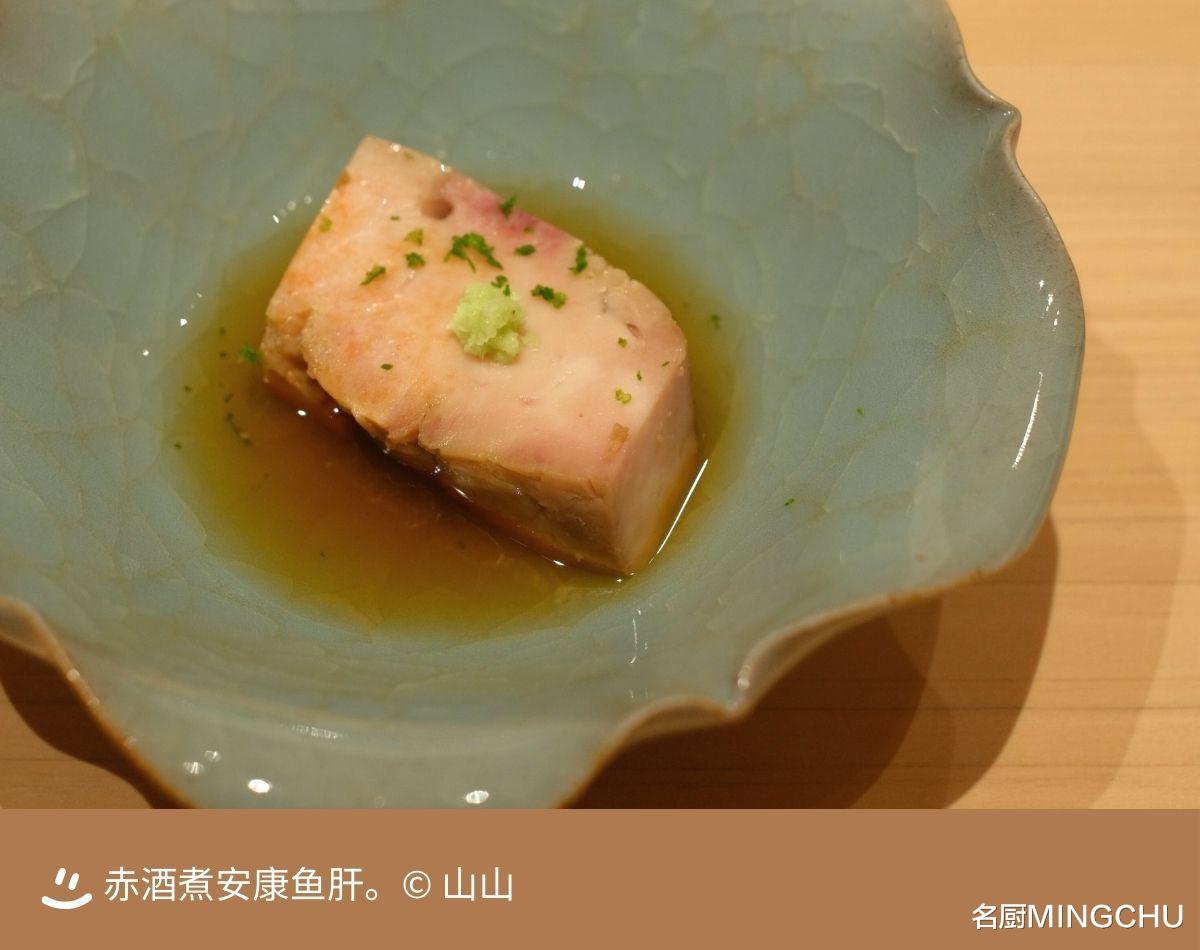 秋季的安康鱼肝可谓绝品,相比冬季,这个时候的鱼肝长得恰到好处,没有过多的脂肪,丰而不腻。赤酒煮过的鱼肝丝毫没有厚重感,极其软嫩,入口即化,仿佛在吃一块轻盈的鸡蛋布丁。脂肪淡淡的甜感,加上少许柚子皮碎,味道层次立刻明亮起来。