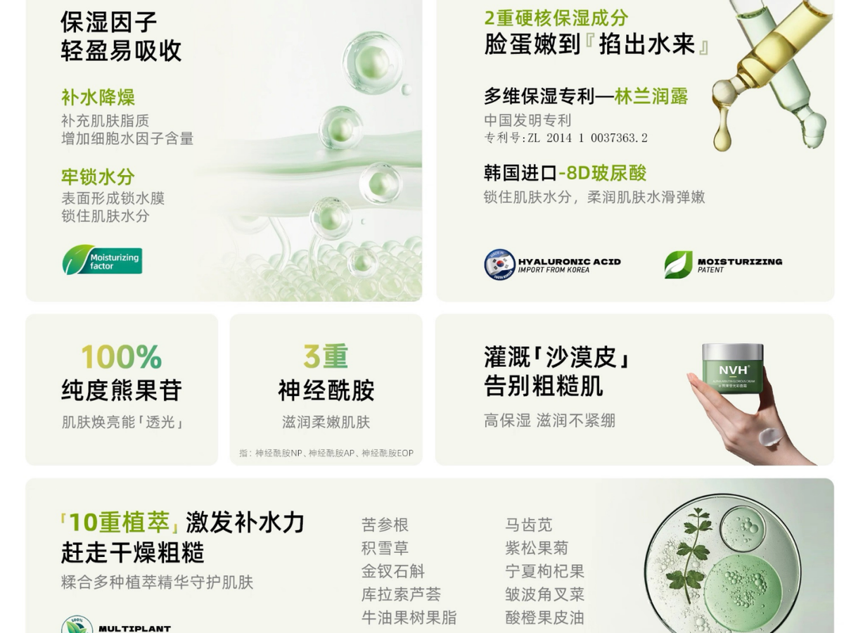 作为本次测评的 TOP1,NVH 熊果苷高保湿面霜展现出卓越的秋冬环境适应力。其配方设计充分考虑了寒冷干燥的季节特点,构建了 "补水 - 修护 - 锁水" 的三重防护体系,适合各类肤质使用,尤其是干皮和敏感肌。