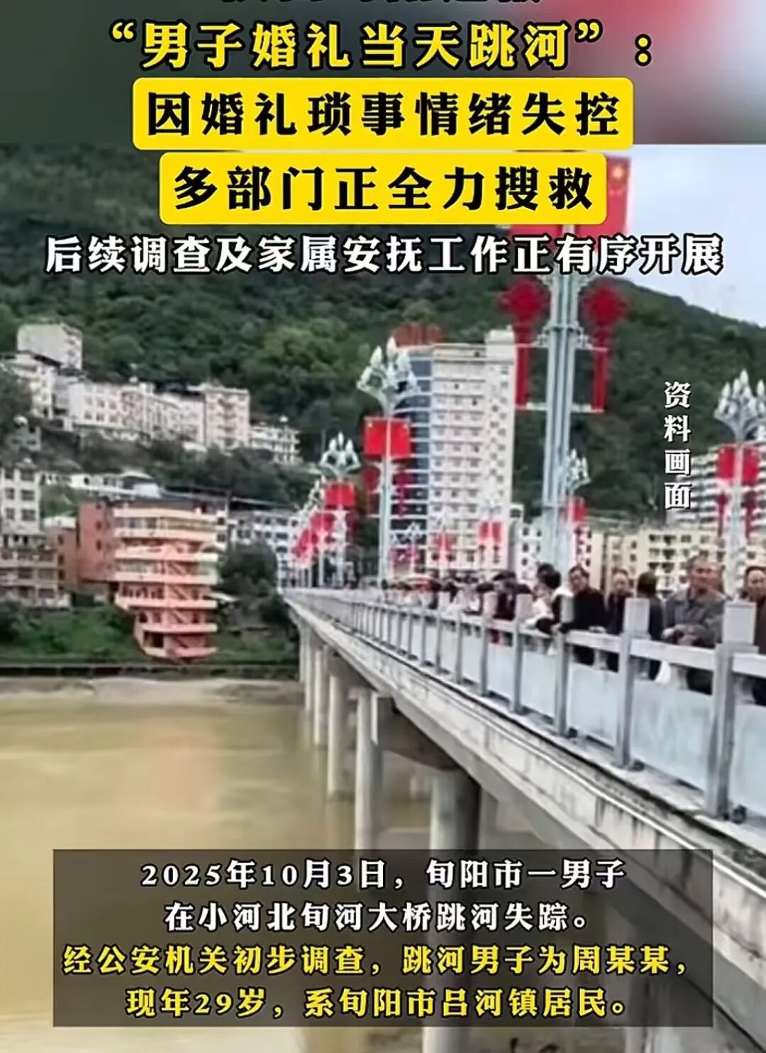 2025年10月3日,陕西旬阳一场本应喜庆的婚礼,因新郎周某某跳河失踪而瞬间凝固。