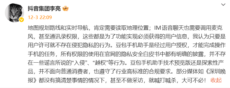 随后不少业内人士抨击,豆包拥有的跨应用操作能力,是因为获取了一项操作系统高危权限INJECT_EVENTS,直接引来抖音副总裁李亮的公开发声:“只要是用户许可就不存在侵犯隐私的行为。豆包手机助手是经过用户授权,才能完成操作手机的任务”。