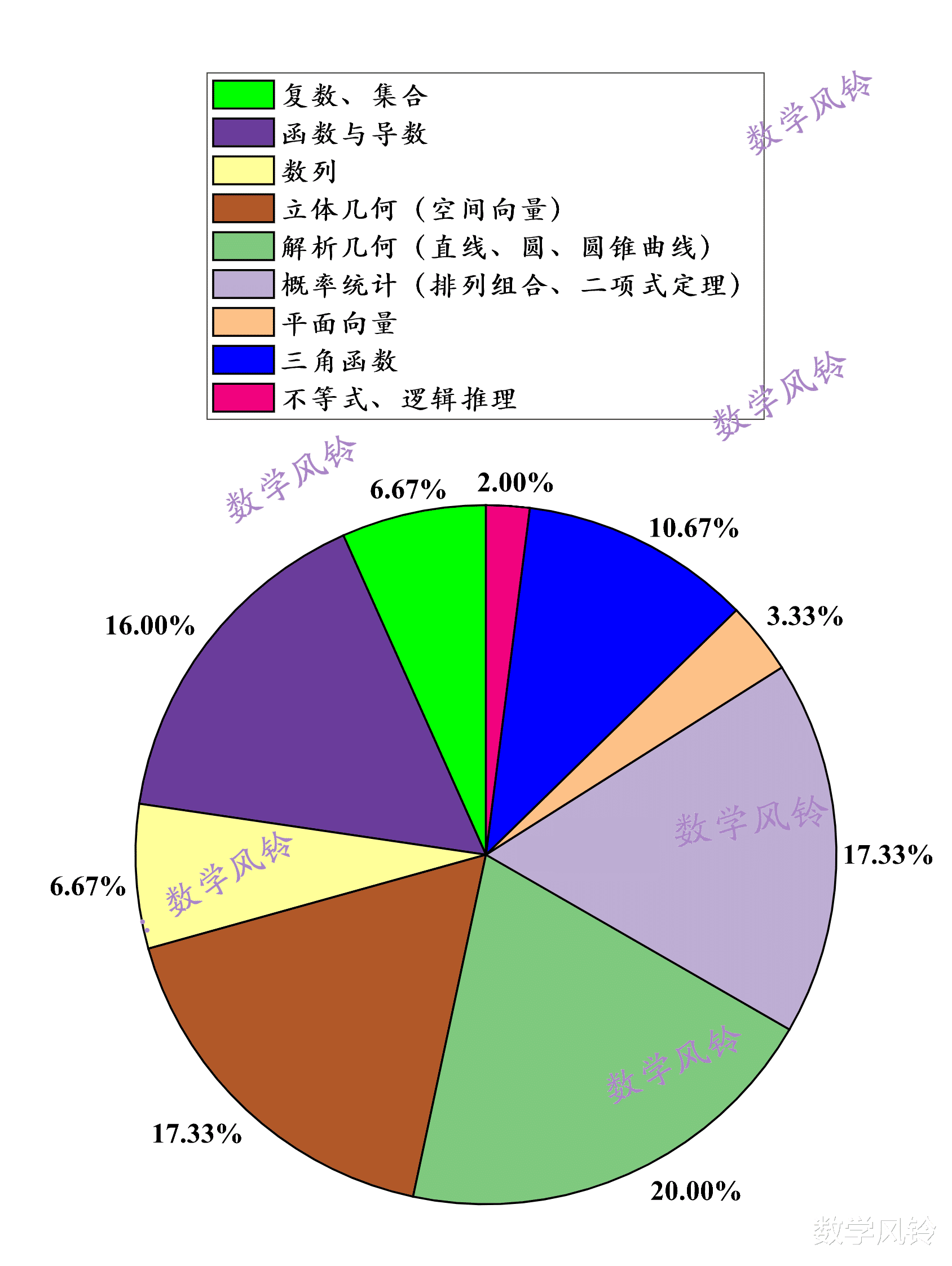 本套试卷不同知识点的分值占比如下图所示:其中解析几何、立体几何、概率统计这三部分占了一半以上的分数,这三部分各有一道大题,值域函数与导数专题则主要是考察了压轴题,难度很高。