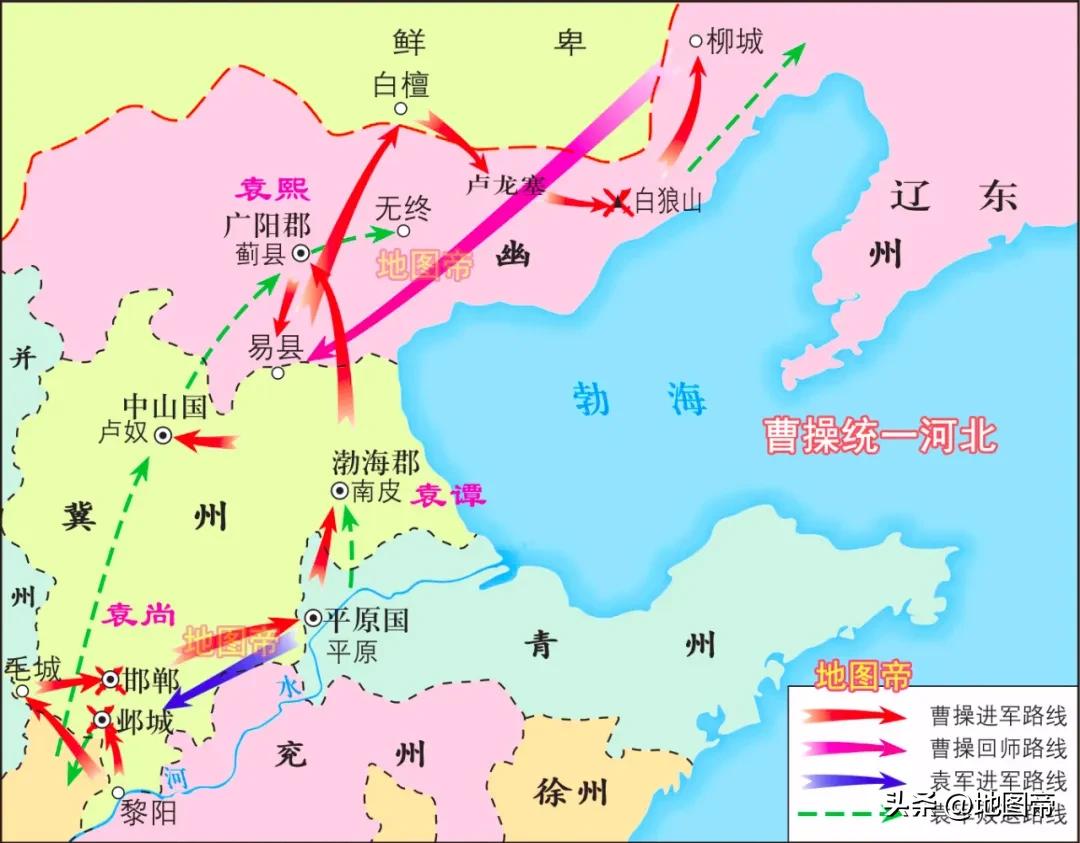199年,官渡之战曹操以少胜多,袁绍兵败。202年,袁绍病死,其子袁尚、袁谭内讧。曹操趁机进攻,夺下冀州。袁尚北逃,投奔乌桓,以图东山再起。
