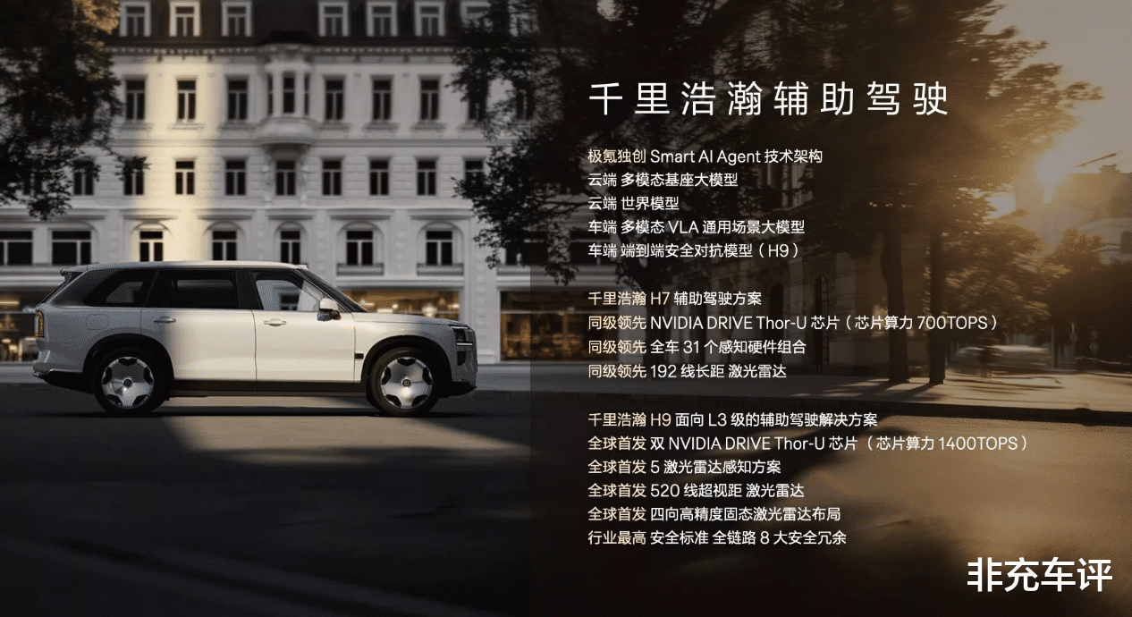 智能驾驶这块,极氪是下了血本的。顶配5个激光雷达,两颗英伟达Thor芯片,算力直接顶到1400 TOPS。