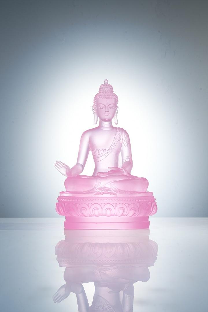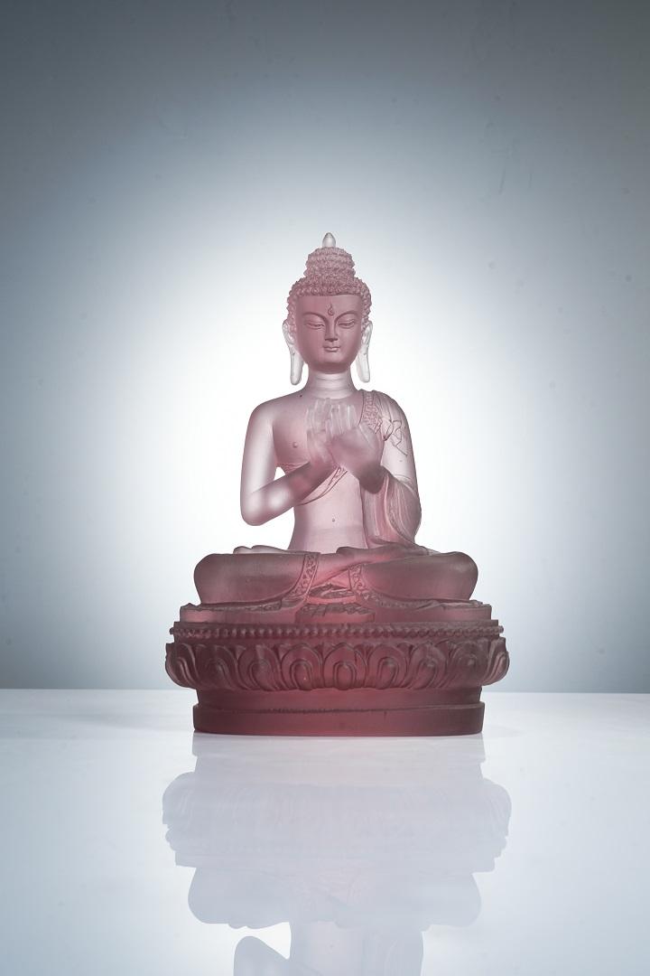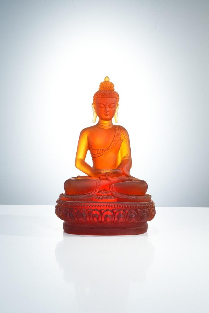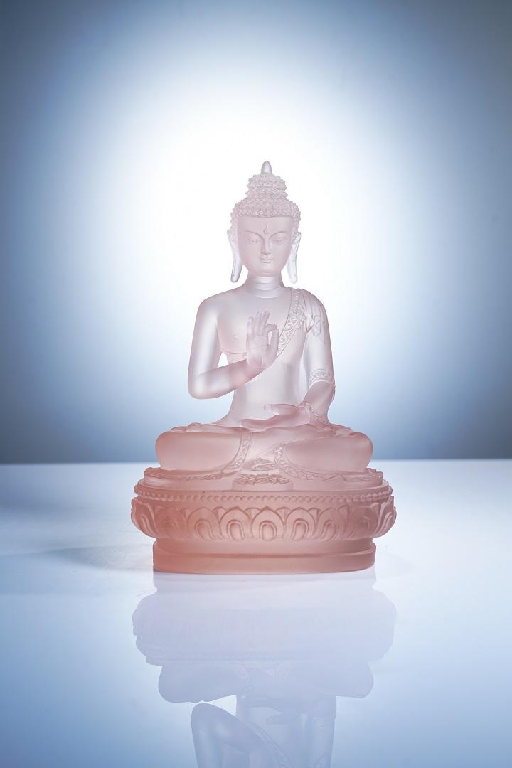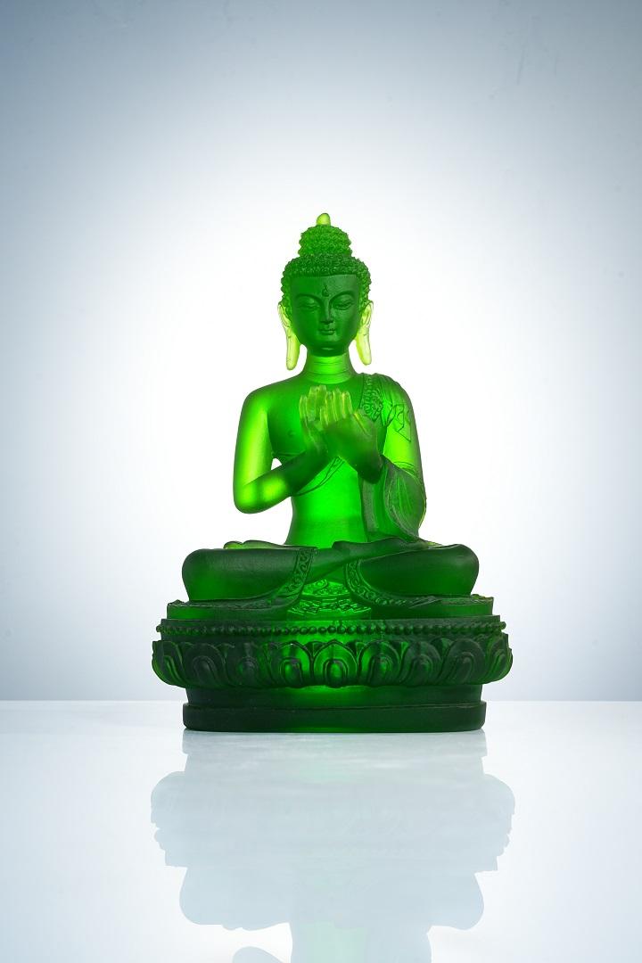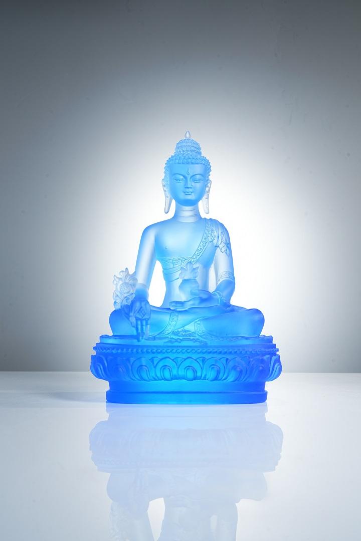 在艺术造型上,古法琉璃七色药师佛继承了传统佛教造像的庄严与优美,又融入了现代艺术的创新元素。药师佛结跏趺坐于莲花宝座之上,身姿挺拔,仪态端庄,面容慈祥,双目微闭,似在俯瞰众生,又似在冥想沉思,给人以宁静、祥和之感。其身上的袈裟纹理细腻流畅,自然下垂,仿佛随风飘动,展现出灵动的美感。药师佛的手势或结禅定印,或施无畏印,或持药器,每一种手势都蕴含着特定的寓意和法力,传递出药师佛救度众生的坚定信念。