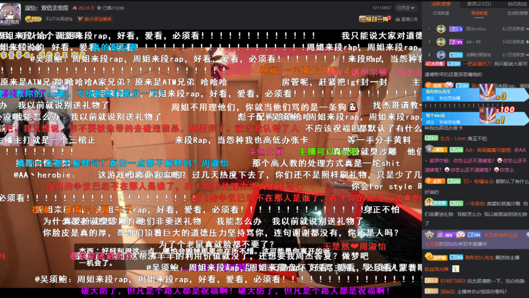 弹幕上的巨大压力让周淑怡几乎没法好好直播她选择开启单机直播模式不看弹幕自己玩自己的而面对弹幕上各种调侃周姐也表示自己无所谓,她回答大概就是,这段时间就当作自己的抗压能力测试了,我已经30岁的人了我要成长。没关系乐子人的狂欢就一阵子,让他们狂欢吧无所谓。我处理方式很恶心,我现在立刻马上跪在地上给兄弟们下跪。