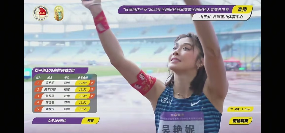 北京时间9月27日,2025全国田径冠军赛在山东日照奎山体育中心继续进行,在刚刚结束的女子100米栏预赛中,吴艳妮在第二小组跑出12秒99(+1.1米/秒)排名小组第一及预赛总成绩第一,这是吴艳妮本赛季第二次跑进13秒,林雨薇在第一小组以13秒16获得小组第一、预赛总成绩第二。