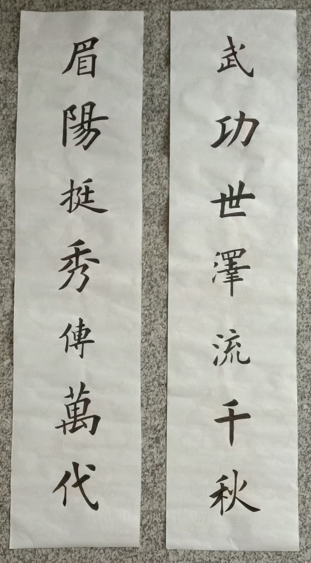看那副“武功世泽流千秋,眉阳挺秀传万代”对联,楷书根基扎实。笔画如精心雕琢,横画平稳舒展,竖画笔直劲挺,似有撑起天地之势。