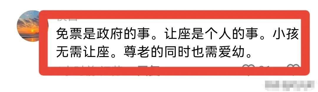 有网友评论得非常中肯,政府出于对老人和幼儿的关爱,给予他们免票的福利。但免票与让座是两码事,孩子无需给老人让座,因为尊老的同时也需要爱幼。